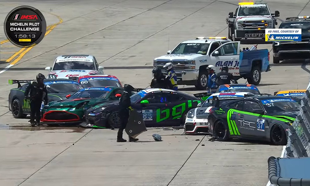 A total of nine cars: No. 3 CSM, No. 83 BGB Motorsports and No. 91 VRC Porsche 718 Cayman GT4 RS Clubsports, No. 71 Rebel Rock Racing Aston Martin Vantage GT4 Evo, No. 4 Medusa Motorsports, No. 60 KohR and No. 30 LAP Motorsports Mustang GT4s, No. 37 CarBahn with Peregrine Racing and No. 96 Turner BMWs ad No. 24 Murillo Racing Mercedes-AMG GT4 were collected in the crash.