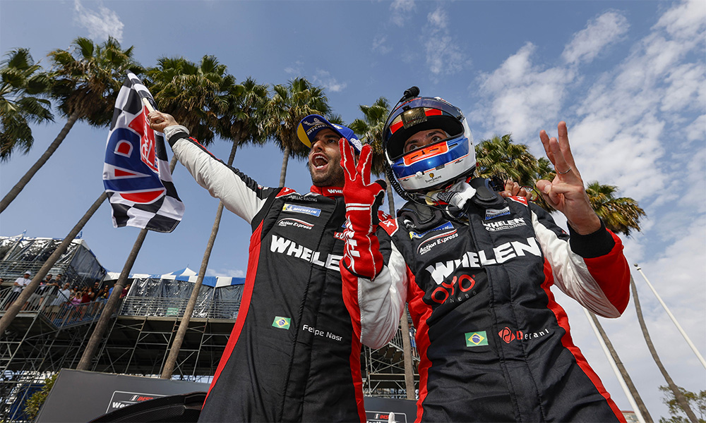 Pipo Derani and Felipe Nasr have closed the DPi points gap with a commanding victory in Saturday’s Acura Grand Prix of Long Beach.