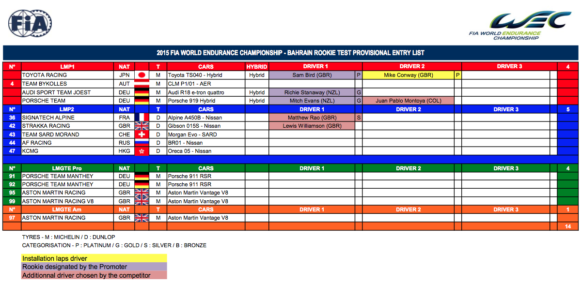 A number of other FIA World Endurance Championship teams will join the previously announced efforts from Porsche, Audi and Toyota in next month’s Rookie Test in Bahrain, with the provisional entry list for the Nov. 22 test having been released.