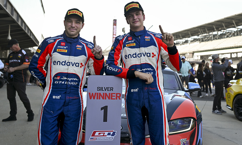 RAFA Racing Team’s Tyler Gonzalez and Gresham Wagner claimed victory in the first Pirelli GT4 America race of the weekend at Indianapolis Motor Speedway, while Random Vandals Racing’s Kenton Koch and Kevin Boehm clinched the Silver class title by just starting the race.
