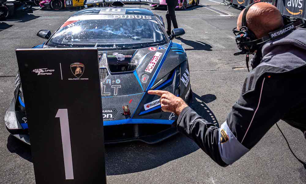 Guido Luchetti, driving solo aboard the No. 10 Lamborghini Huracan Super Trofeo EVO2, overcame a five-second penalty on Saturday to claim his maiden victory in the series, while a decision to start on slicks in damp conditions allowed Patrik Fraboni and Giacomo Pedrini to lead a 1-2 for the team on Sunday.