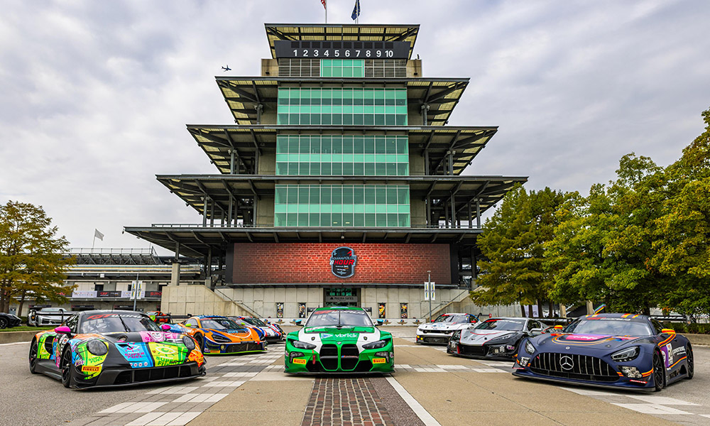 ***Eight GT3 manufacturers are set to do battle in Saturday’s sixth edition of the Indy enduro, with an example from all brands except the Aston Martin Vantage GT3 Evo having assembled for a group photo on the yard of bricks (pictured above) on Wednesday.