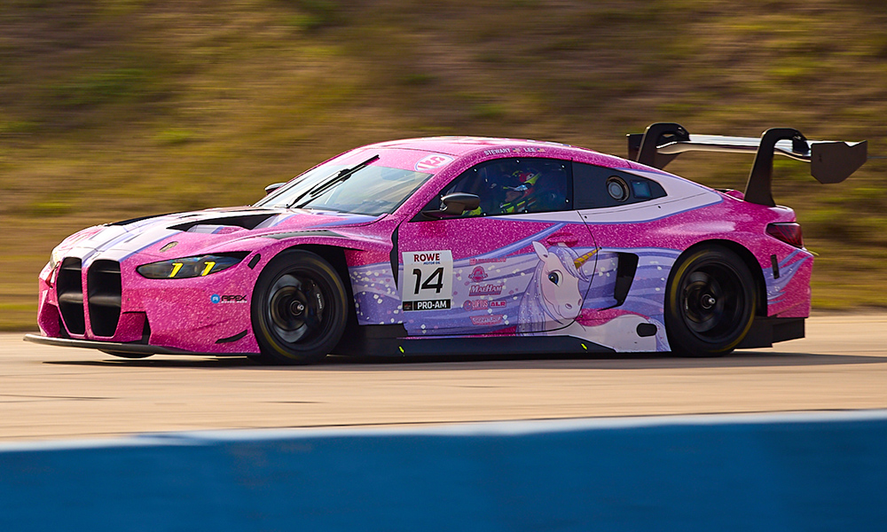 The same livery, designed by Stewart’s children, has been transplanted on to the No. 14 BMW for Stewart’s GT3 debut.