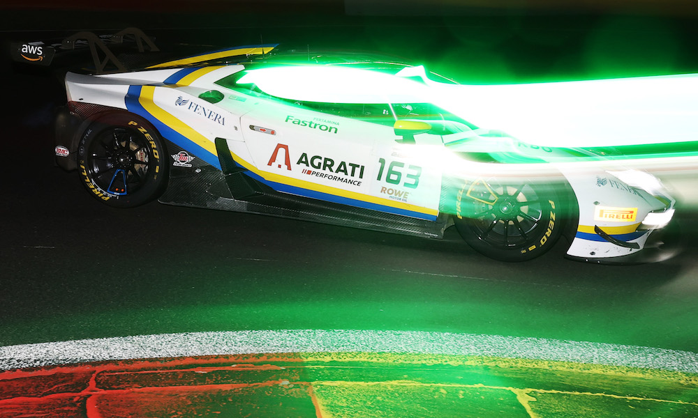 A quicker pitstop during the ninth round of stops allowed the No. 163 Lamborghini Huracan GT3 EVO2, driven by Marco Mapelli, to leapfrog ahead of the No. 17 Mercedes-AMG GT3 Evo of Luca Stolz.